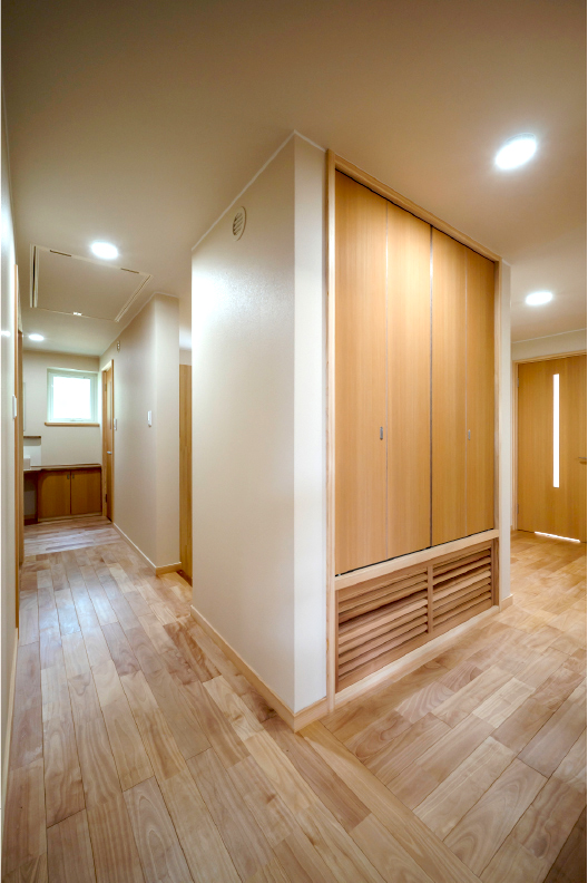 高気密高断熱住宅であればエアコン一台で家全体を暖房できると言われます。しかし、いくら高気密高断熱であっても、部屋が壁や扉で間仕切られていたら暖気は各部屋にいきわたらず、まともに暖まるのは結局エアコンを設置した部屋だけになってしまいます。この点、床下エアコンは家の床下全体をエアコンで暖め、床に設けたスリットから暖気を室内へ上げてやるため、部屋が間仕切られていても暖気が各室にいきわたります。床下の暖気は、暖かい空気は上に昇るという性質を利用して室内へ上がって来るだけなので、ファンなどは使っていません。そのため静かで、不快な風も感じません。暖気を送るだけでなく床自体を暖める効果があるため、底冷えがなく心地よく室内が暖まります。
