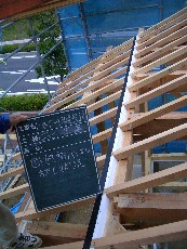 (左)垂木を打って間に断熱パッキンを入れて屋根板を打ちます。