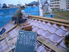 (左)通気垂木の上に二層目の屋根板を張ります。