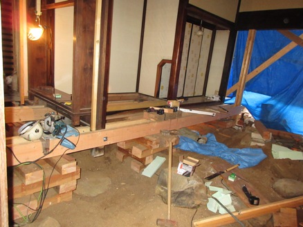 床組が外せない所は大工さん床下に潜り込んで寝転んでの作業です。
